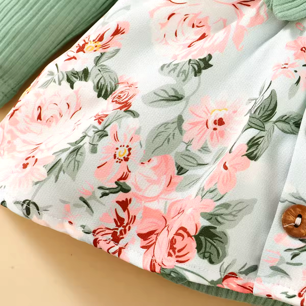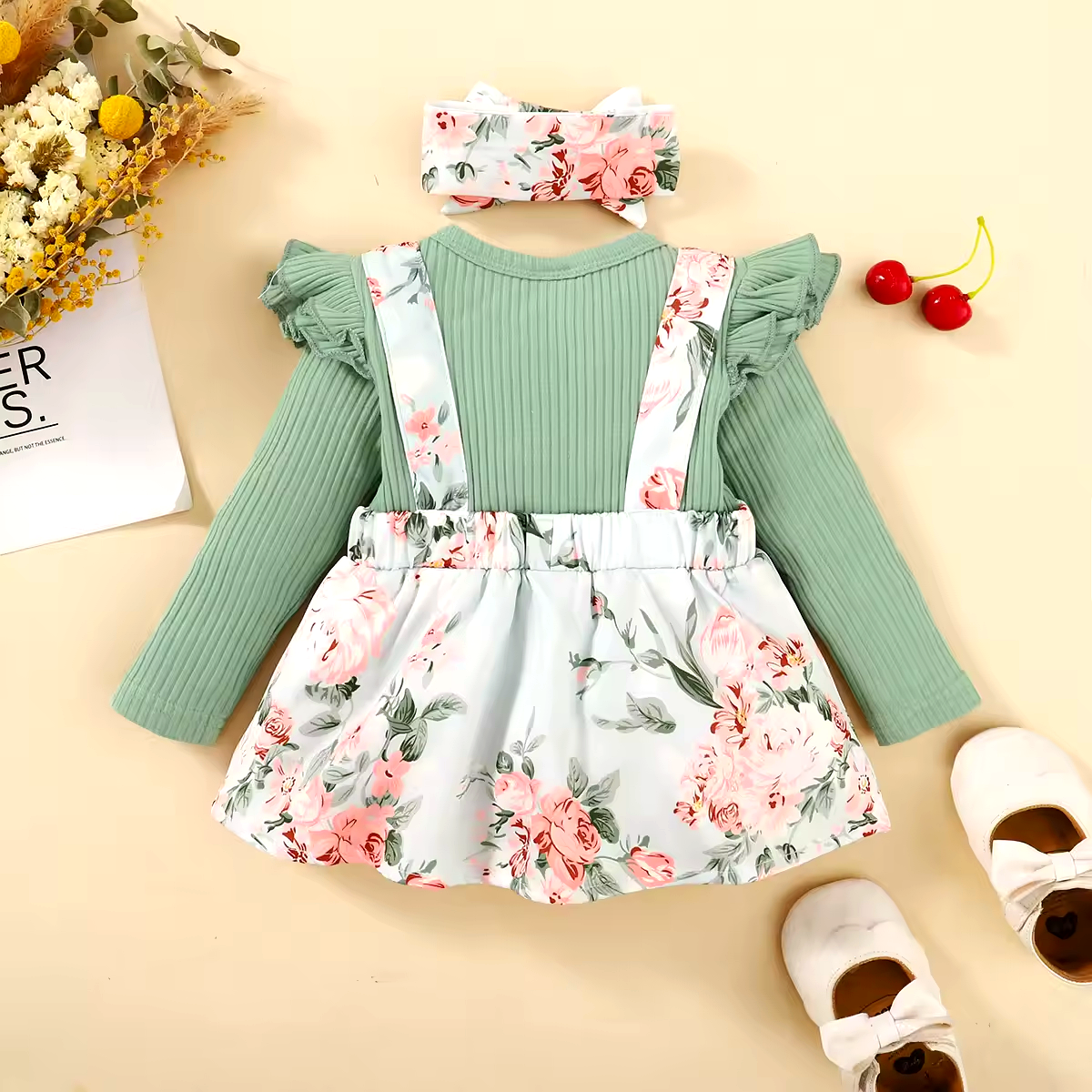 Detta bedårande 3-delade set för flickor består av en mjuk långärmad topp i ribbad bomull, en blommig hängselklänning samt ett matchande hårband. Perfekt både till vardag och speciella tillfällen som dop, fotografering eller kalas. Kombinationen av mjukt tyg och söt design gör detta set både bekvämt och stilfullt för de minsta.