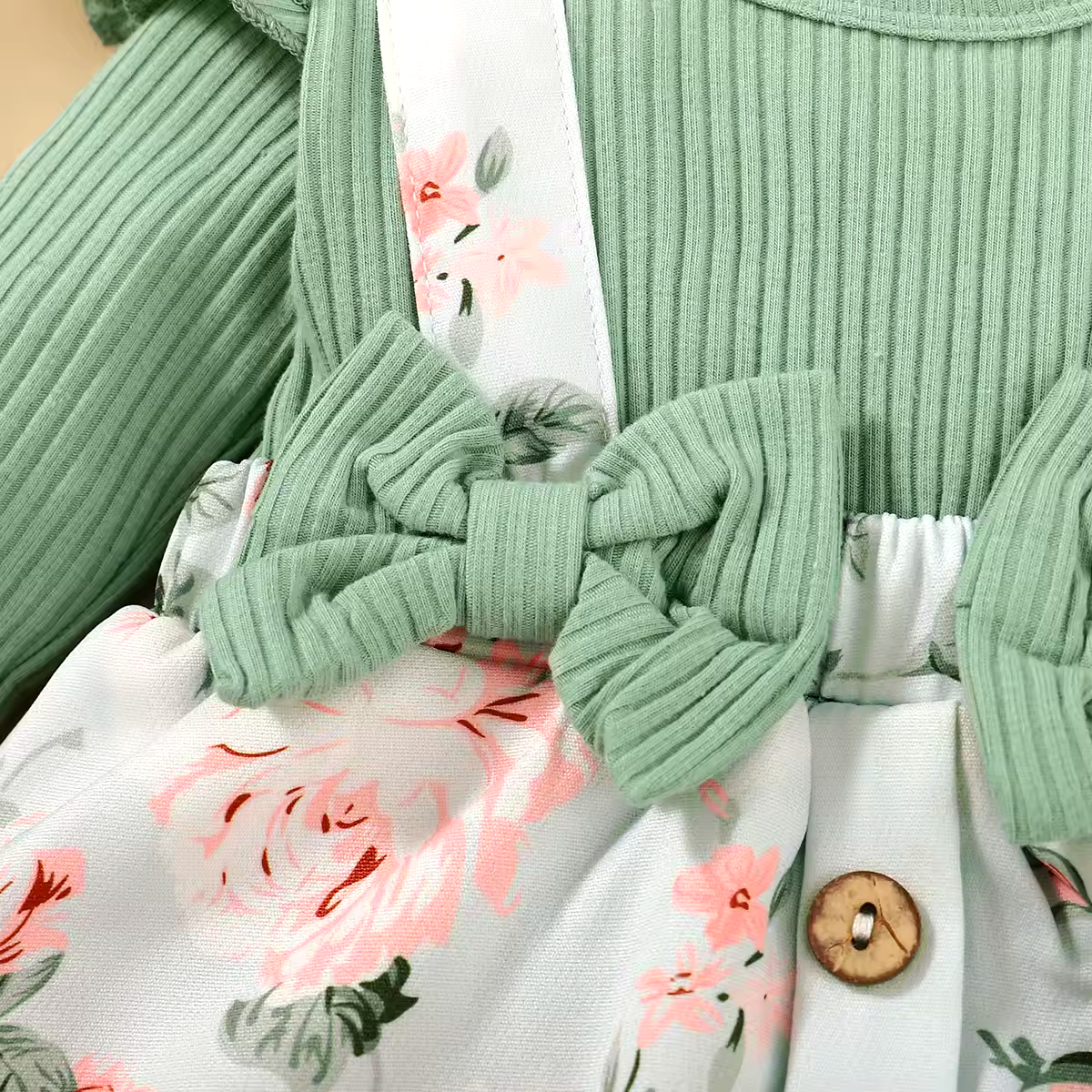 Design: Ribbad topp, blommig klänning med hängslen, dekorativa rosetter