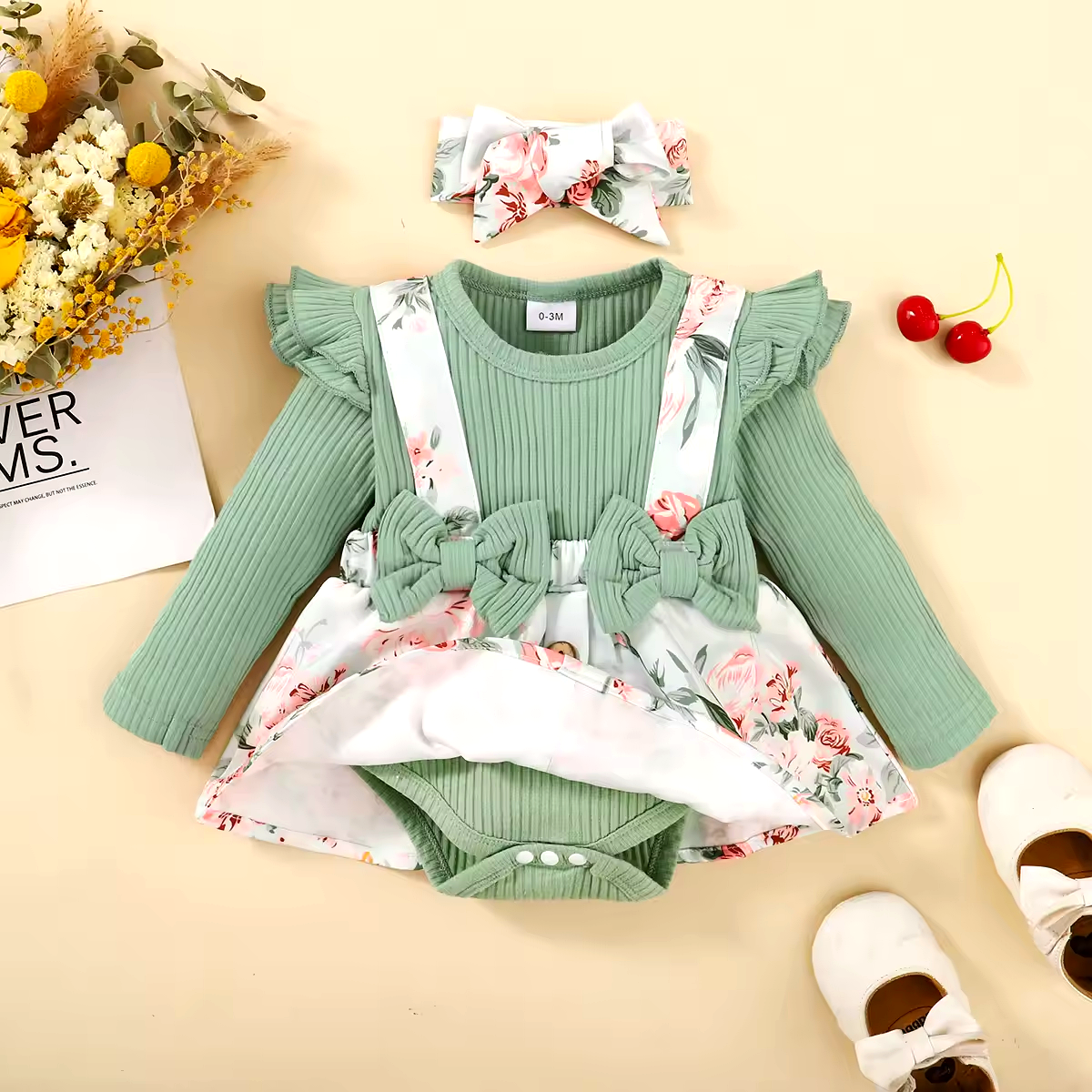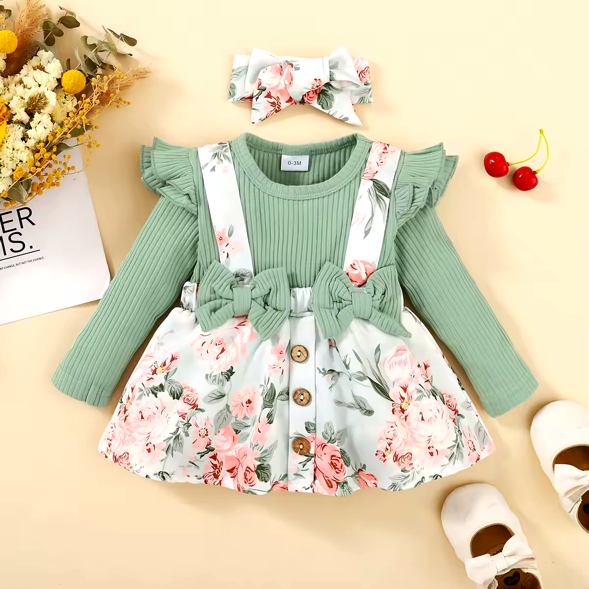 Babyklänning med Hängsel & Hårband – 3-delat Set för Flickor