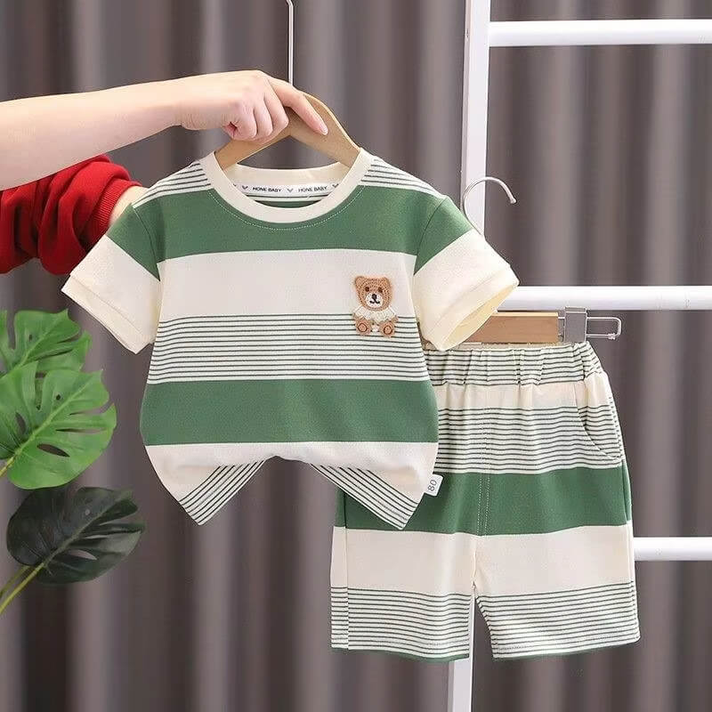 Detta stilrena och bekväma sommarset är perfekt för både pojkar och flickor. Setet består av en randig T-shirt och matchande shorts, tillverkat av mjukt och luftigt material för maximal komfort under varma dagar. En söt björndetalj på bröstet ger extra charm och lekfullhet till outfiten. Perfekt för både vardagsbruk och sommarens äventyr!